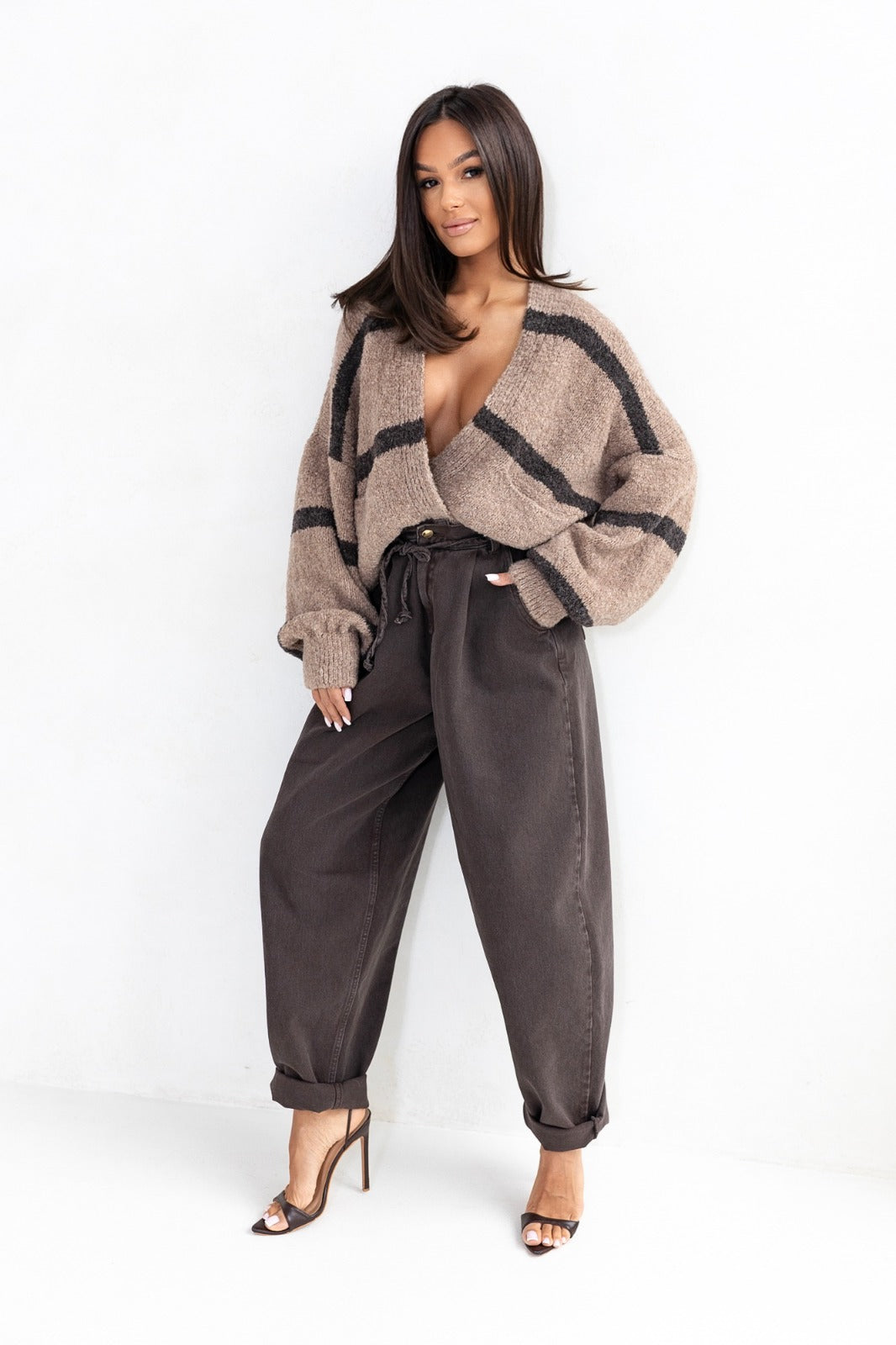 Las rayas anchas en contraste aportan un toque contemporáneo al look clásico del punto. Cada línea está estratégicamente ubicada para estilizar la figura y añadir ese aire chic que transforma lo simple en especial.