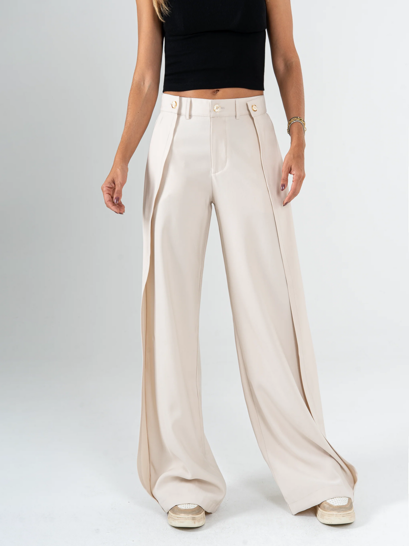 Este pantalón de corte amplio redefine el estilo urbano moderno. Su silueta relajada aporta un look sofisticado sin esfuerzo, ideal para combinar con tops, camisas o prendas básicas.