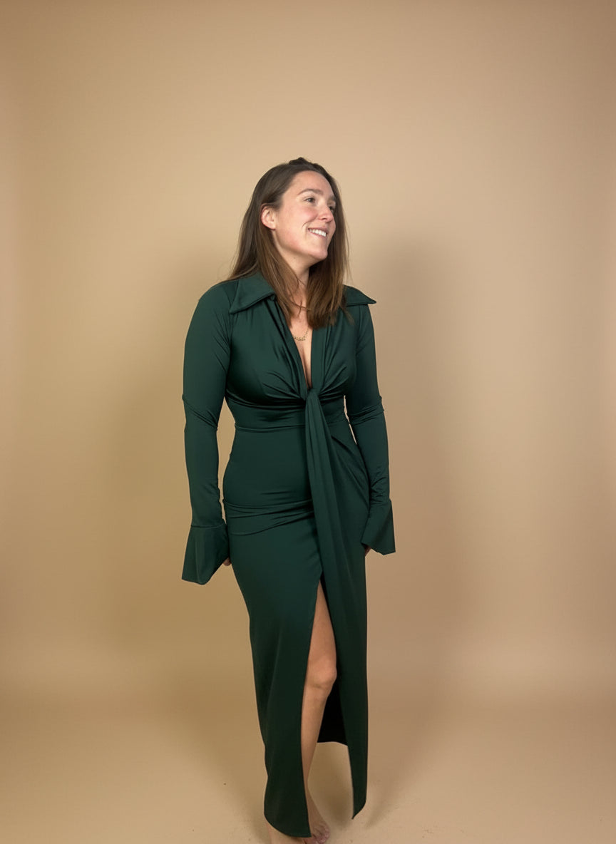 Este vestido es la definición de una pieza de impacto. Su diseño fusiona la formalidad del cuello camisero con la audacia de un escote profundo y una abertura frontal. Es la elección perfecta para capturar todas las miradas en cualquier evento nocturno o celebración.